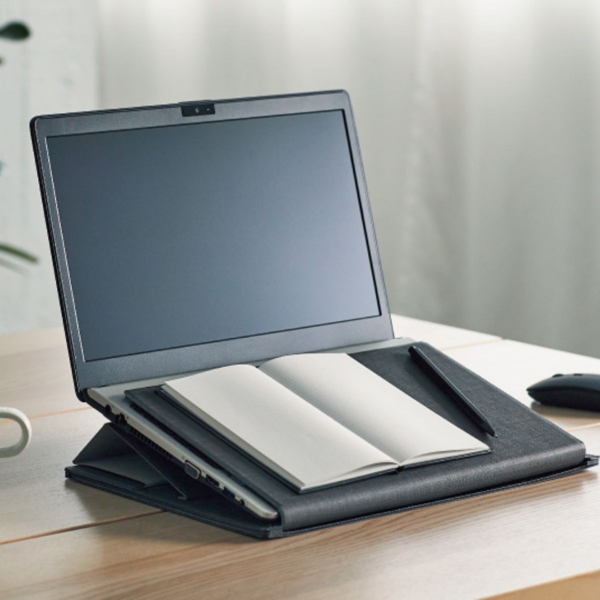 Notebook PC stand with a slide board that can be used as a writing table.